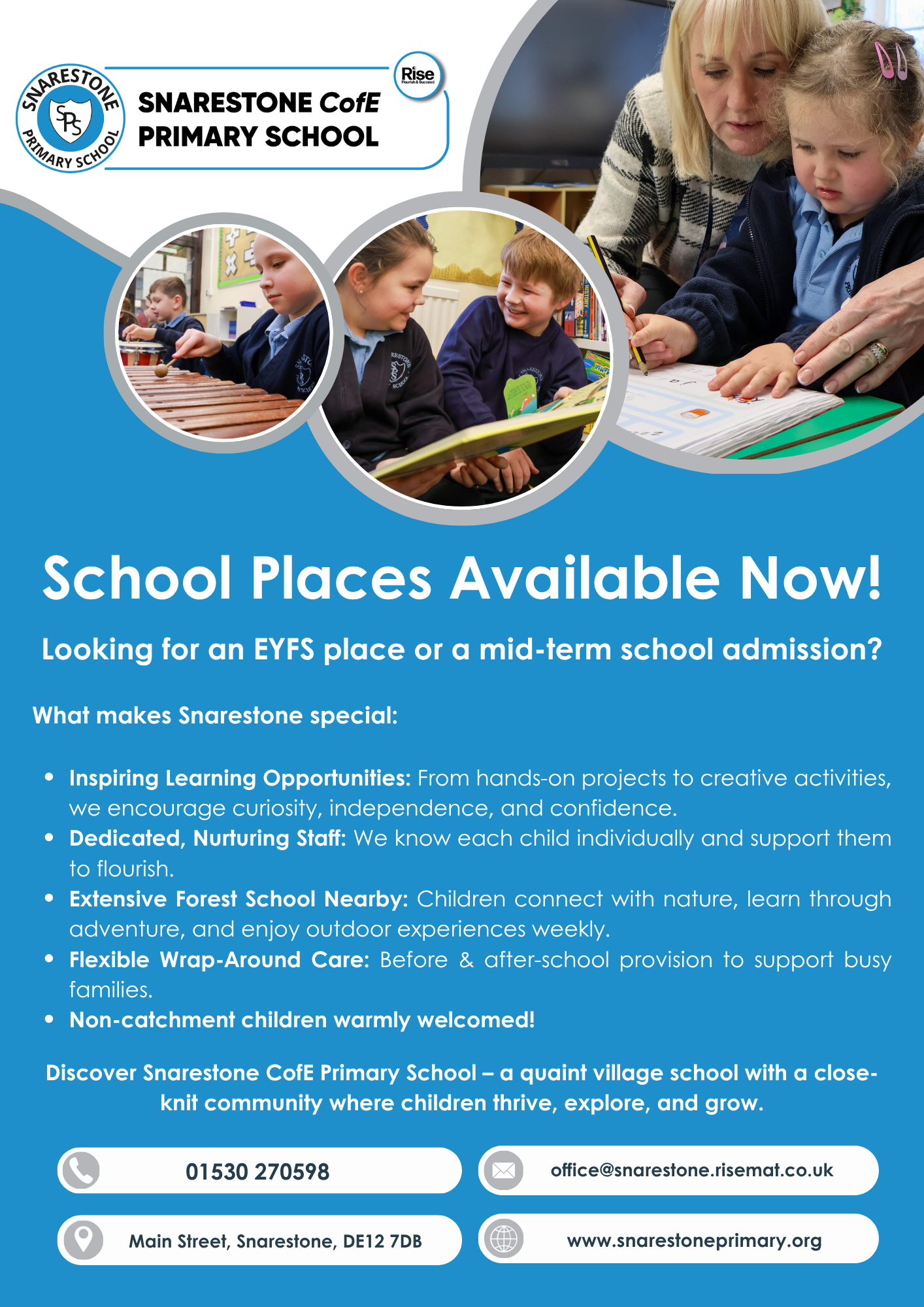 If you are thinking of moving your child(ren) to our school, in the first instance, please contact the school to arrange a visit via 01530 270598 or office@snarestone.risemat.co.uk to enquire if we have places available in the relevant year group(s). We will offer you a tour of the school with a representative from our leadership team.