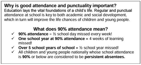 - Attendance advice and updates are shared each half-term as part of the school newsletter.